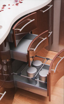 Для данной модели характерны изогнутые формы, чередование вогнутых и выпуклых поверхностей. Фасады МДФ толщиной 18 мм и с характерным скосом покрыты высокоглянцевой полиуретановой эмалью итальянского производства. По желанию заказчика на фасадные элементы наносится растительный орнамент. Более 600 вариантов цвета.