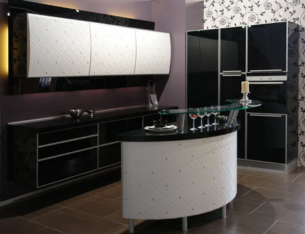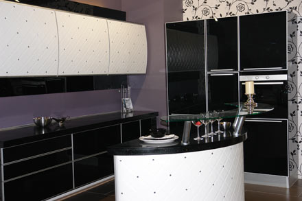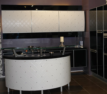 Кухня «Глория 4» - Новое решение для российского рынка! Эффектные фасады из искусственной кожи. Скомбинирована с фасадами из ЛДСП, ламинированными Акрилайном с "глубоким" глянцевым отражением и обработаны алюминием по периметру.