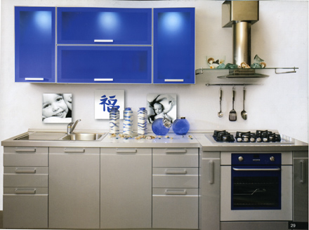 На фасадах из МДФ 16 мм с отделкой полиуретановыми шелковисто-матовыми или высокоглянцевыми эмалями наносится стильный горизонтальный рисунок. Особенностью данного рисунка является фрезерование широкой горизонтальной полосы шириной 68,5 мм. Большой выбор цветов эмали, характерные элементы из алюминия и акрила позволяют создавать каждый раз новые композиции и интересные проекты. В данной модели отсутствуют элементы с гнутыми фасадами. Фасадные элементы с нанесением рисунка могут комплектоваться стеклом «скрин».