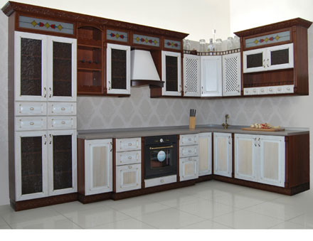 Фасады: массив сосны Столешница: искусственный камень с влитой мойкой Пристеночный плинтус: искусственный камень Стекло с нанесением рисунка Мебельная фабрика Girona успешно воплощает в жизнь любые нестандартные конструкторские решения, а также оригинальные дизайнерские разработки. Итак, представляем Вашему вниманию Коломбиану -кухня игра.
