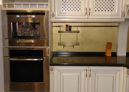 Шедевры великого Леонардо вдохновили современных итальянских мастеров на создание этого гарнитура: роскошный портал, резные колонны и пилястры, матовая позолота на фасадах нежного молочного цвета. Кухня для ценителей творчества эпохи Возрождения.